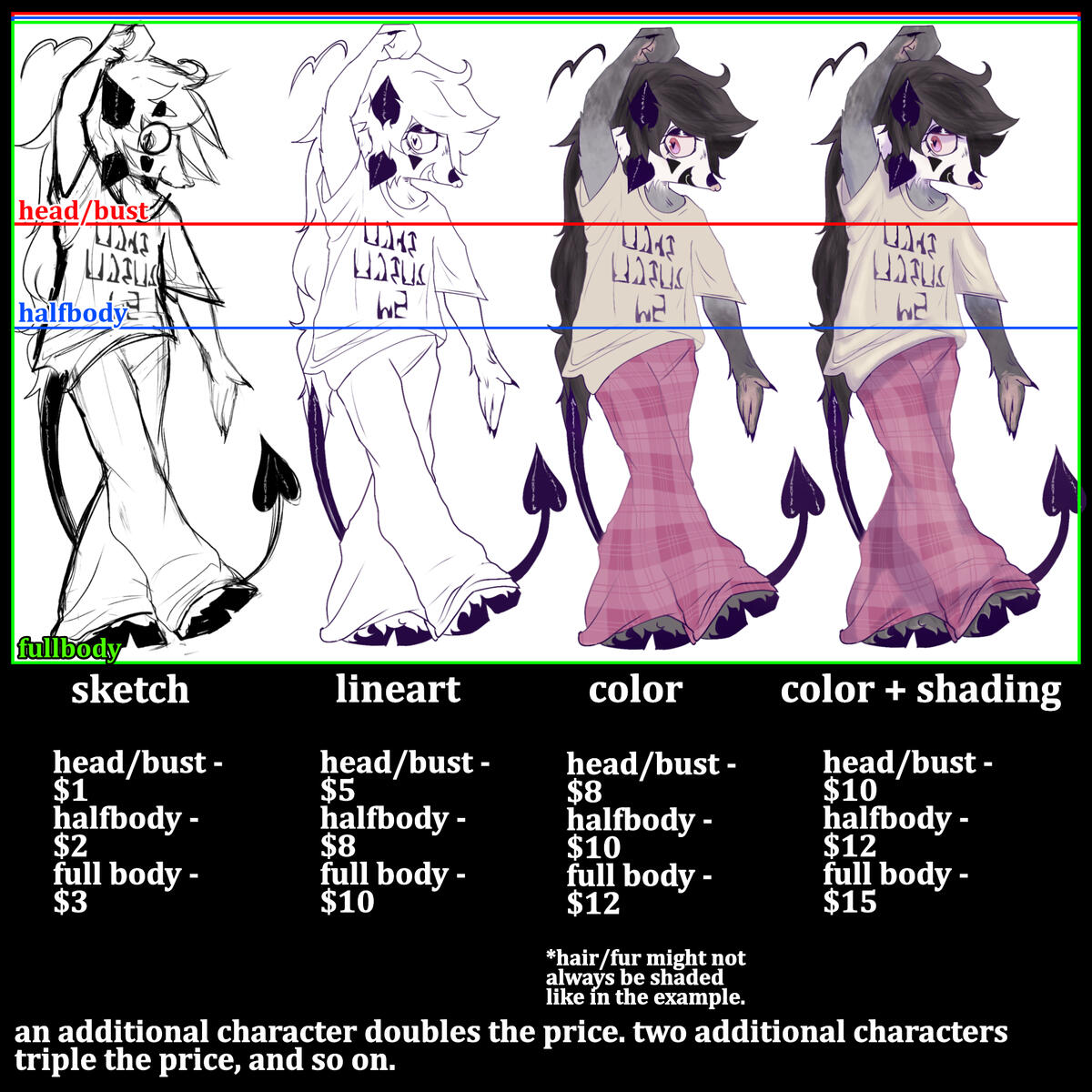 here is the actual commission sheet. the red, blue and green lines seperate head/busts, halfbodies, and fullbodies.if you want to commission me after reading this carrd, message me on instagram (@sn33zy_little_sushi_roll) or discord (gunk goo goo #4279)